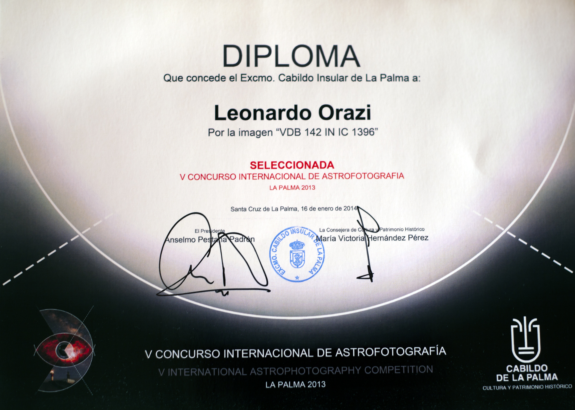 Travelling Exhibition choose in "LA PALMA 2013 INTERNATIONAL ASTROPHOTOGRAPHY COMPETITION" |